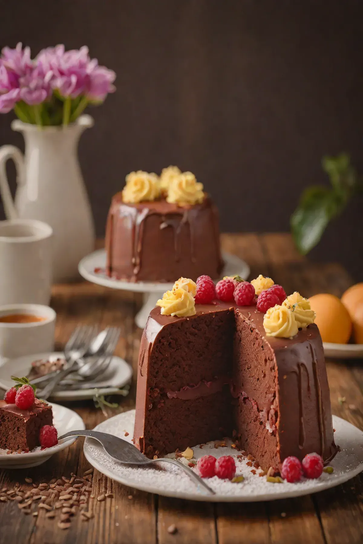 Dust the cake with confectioner's sugar and serve with ruby chocolate glaze.
