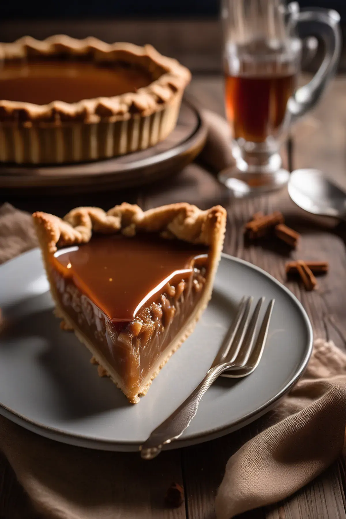 A rich and indulgent pie filled with a gooey salted caramel filling, nestled in a buttery pastry crust.