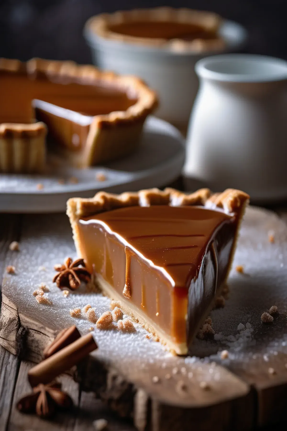 A rich and indulgent dessert featuring a salted caramel filling, nestled within a flaky pastry crust, topped with a layer of crunchy sea salt.