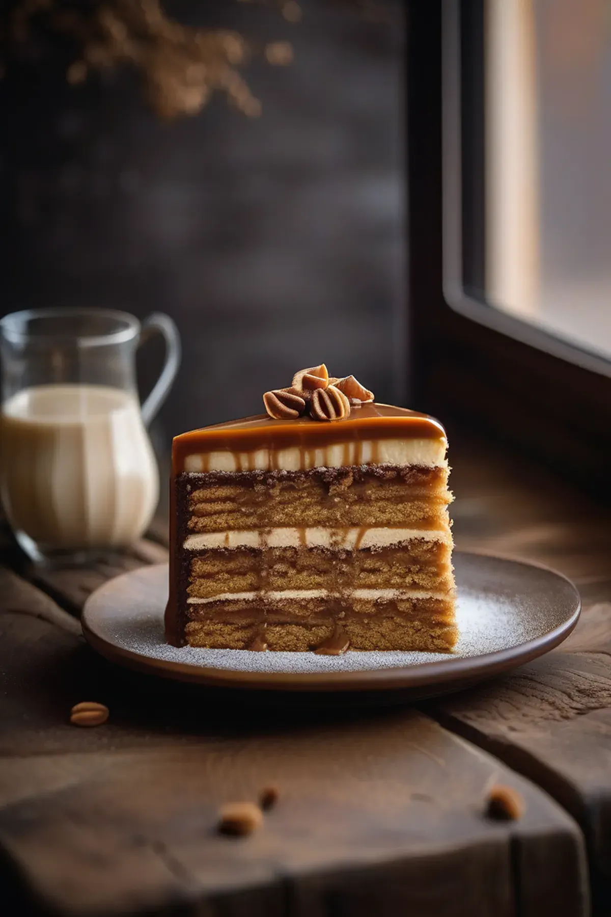 To assemble the cake, place one cake layer on a serving plate and spread a thick layer of salted caramel filling on top.