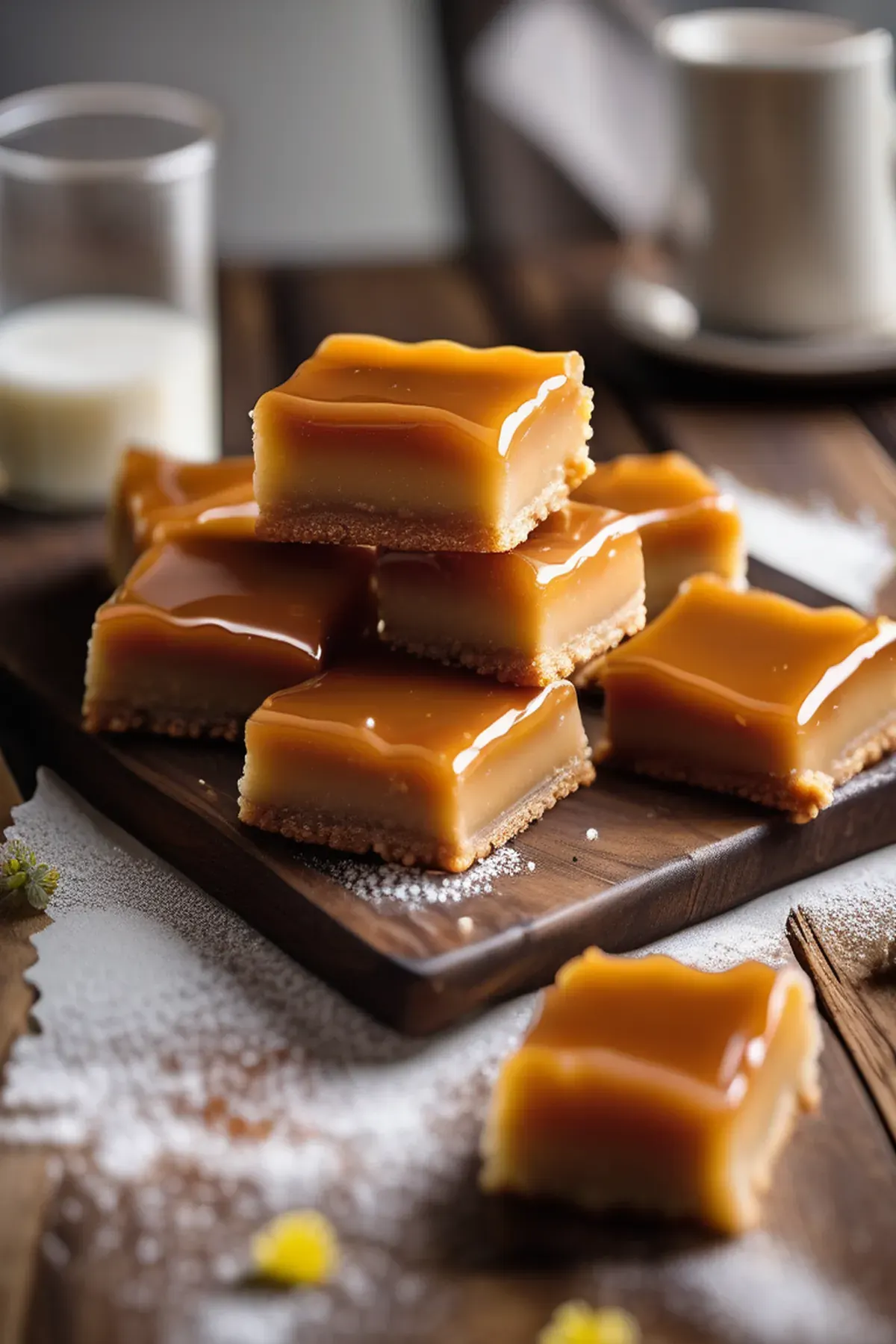 A sweet and tangy dessert featuring a shortbread crust, a lemon curd, and a layer of salted caramel.