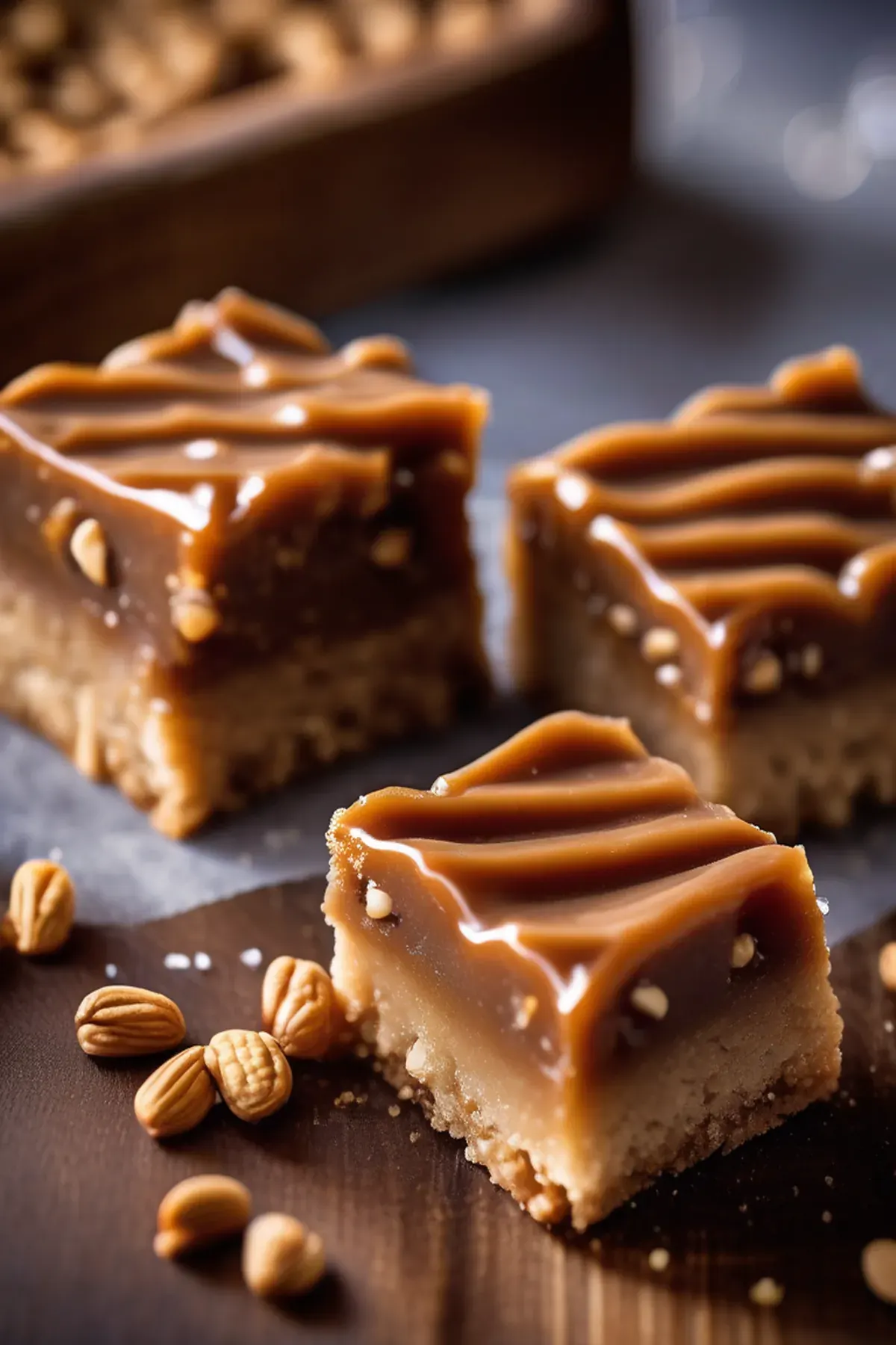 Rich, indulgent bars filled with a salty caramel and creamy peanut butter filling.