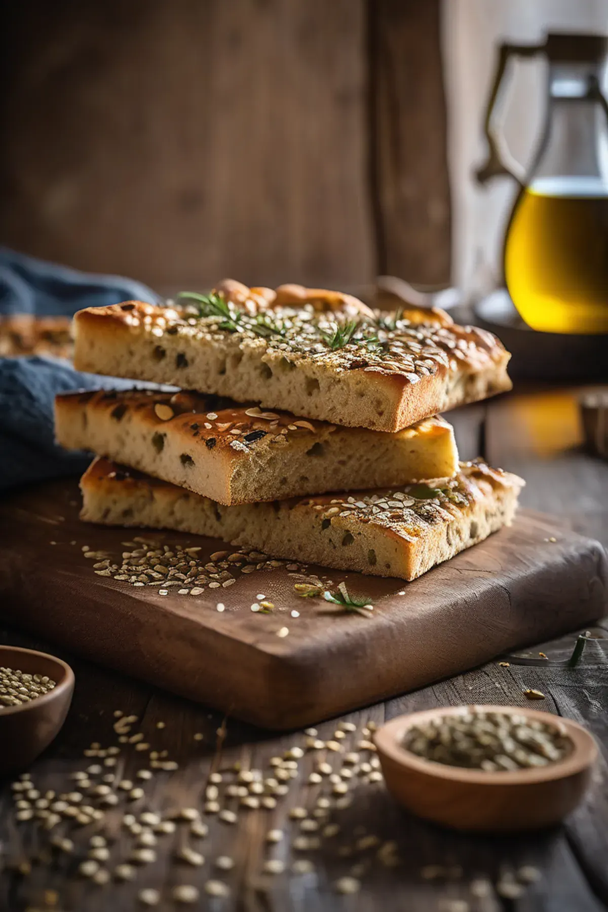 Sprinkle the seed mixture evenly over the oiled dough, pressing gently so seeds adhere. Top with coarse sea salt and fresh rosemary if using.