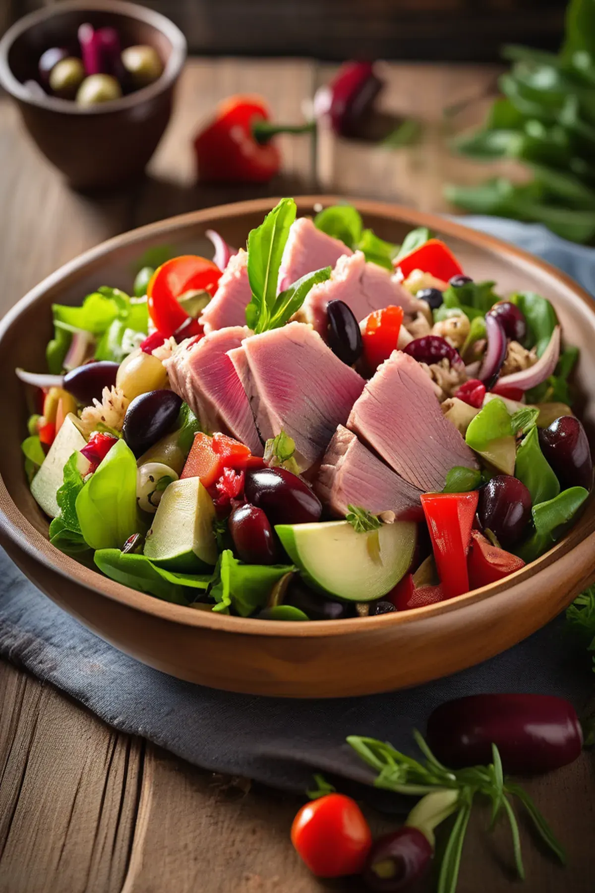 Serve the Spanish Tuna Salad chilled, garnished with additional olives and artichoke hearts if desired.