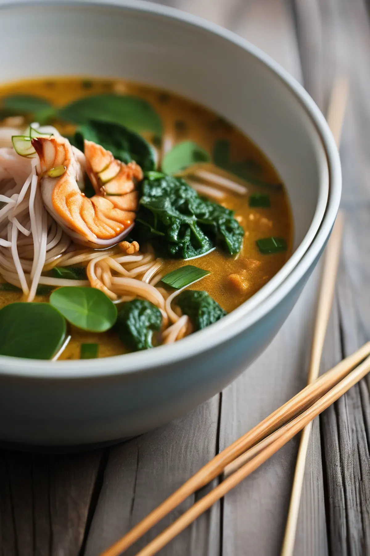 A flavorful and spicy noodle soup originating from Southeast Asia, loaded with tender spinach and aromatic spices.
