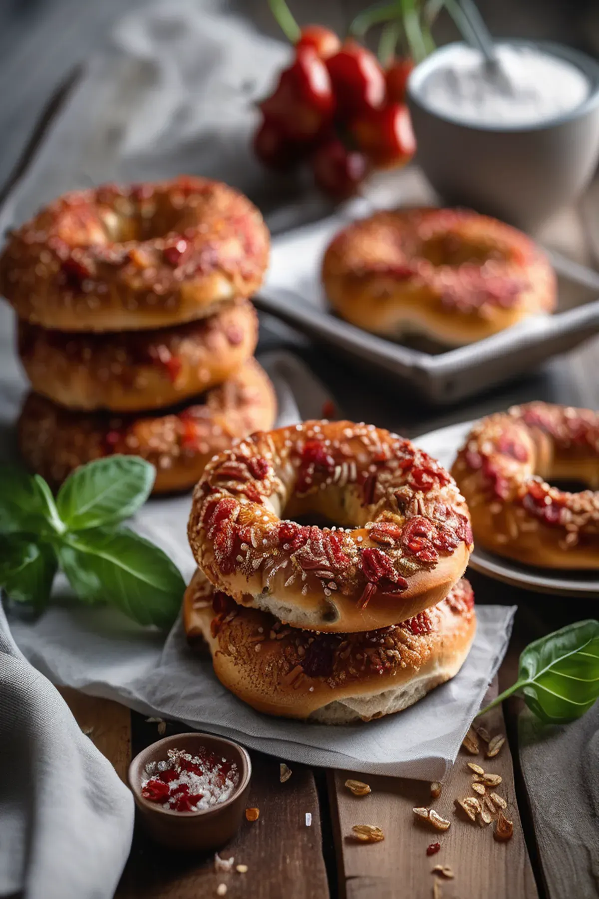 Chewy, tangy bagels studded with sweet sun-dried tomatoes and fresh basil, perfect for toasting and topping with cream cheese or avocado.