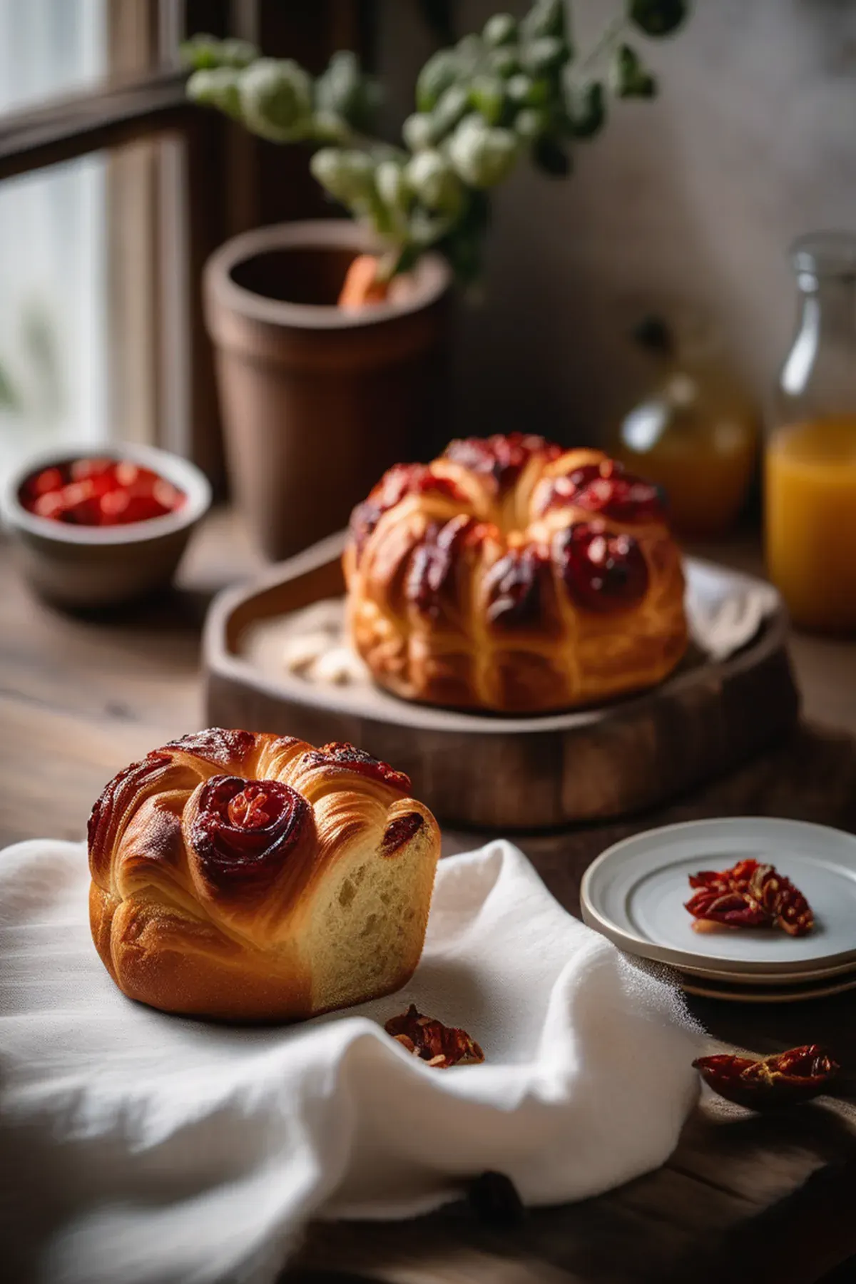 A luxurious sweet and savory brioche enriched with tangy sun-dried tomatoes and fresh basil, perfect for breakfast or as an indulgent afternoon treat.