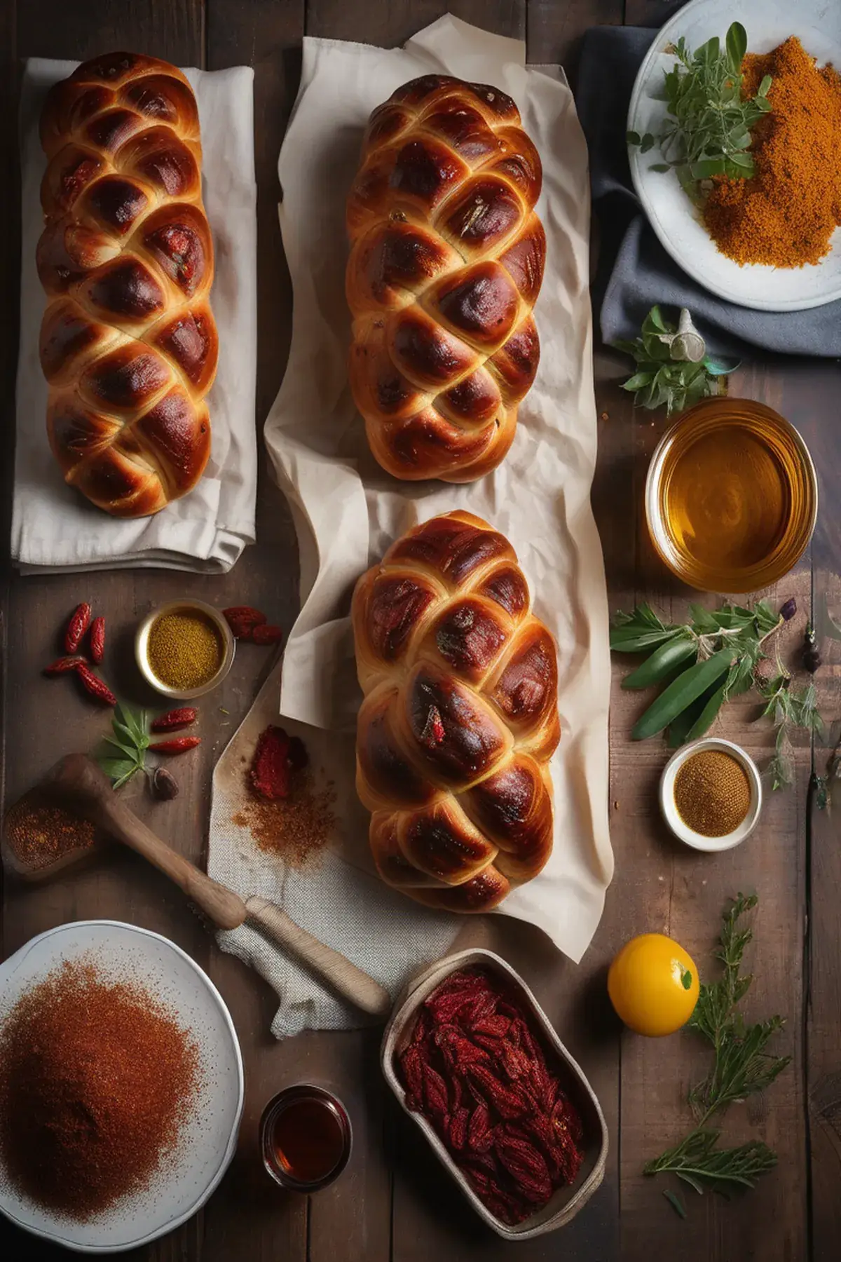 A vibrant twist on traditional challah, swirled with tangy sun-dried tomatoes and fresh basil for a savory-sweet bread that's perfect for special occasions or weekend gatherings.