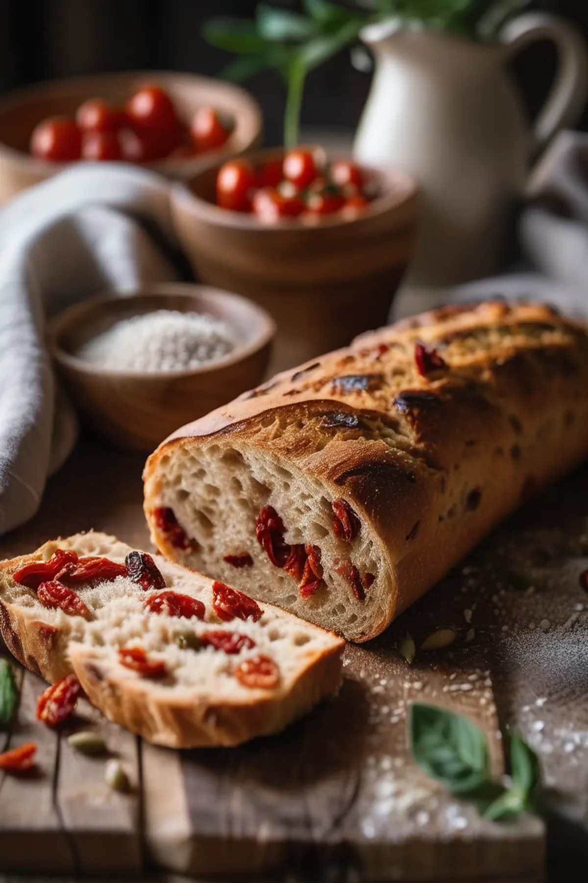 A rustic Italian-inspired bread with chewy texture and bursts of tangy sun-dried tomato throughout, perfect for sandwiches or dipping in olive oil.