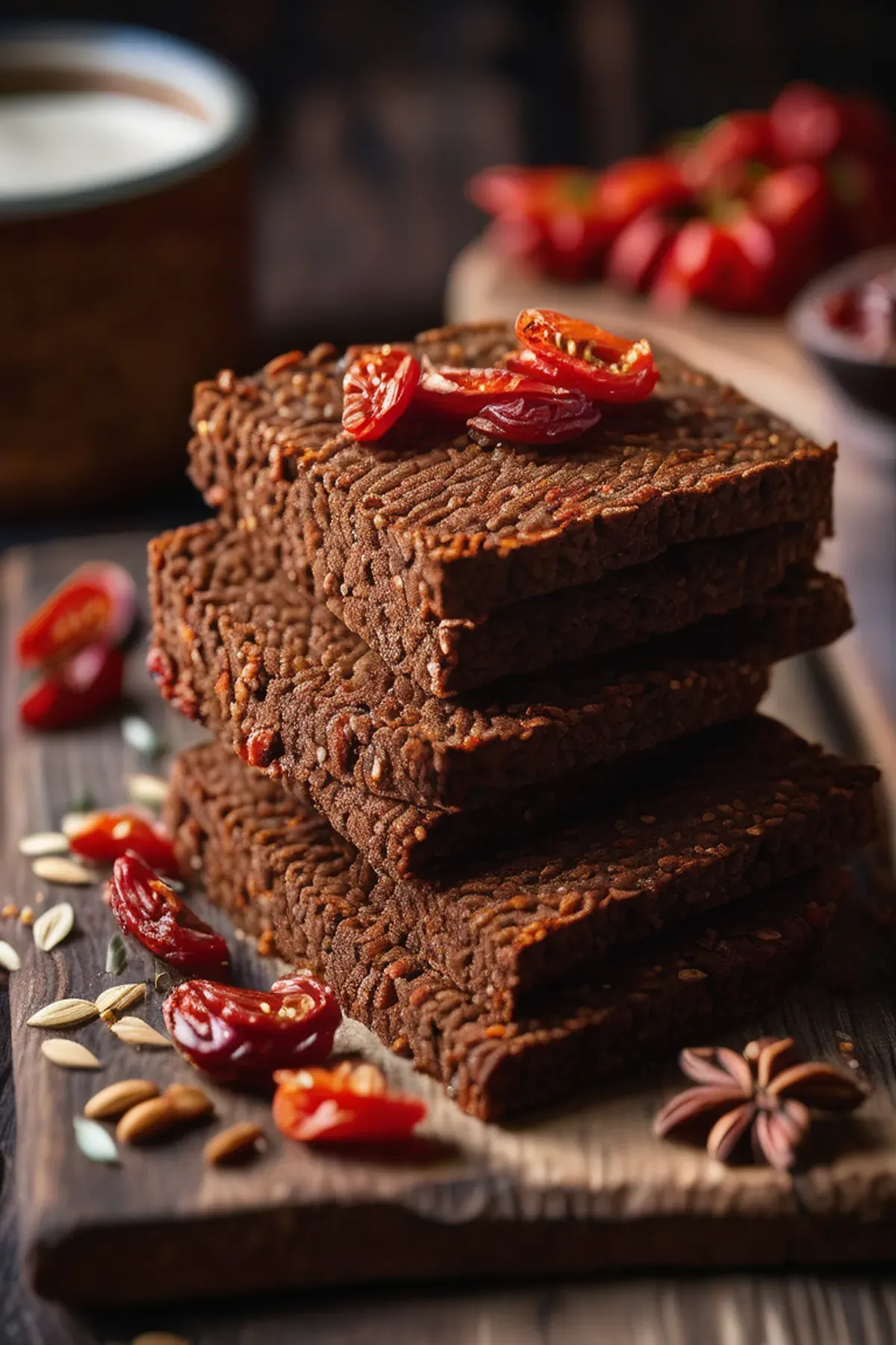 A dense, richly flavored dark rye bread studded with tangy sun-dried tomatoes and aromatic caraway seeds, perfect for hearty sandwiches or serving alongside soups and stews.