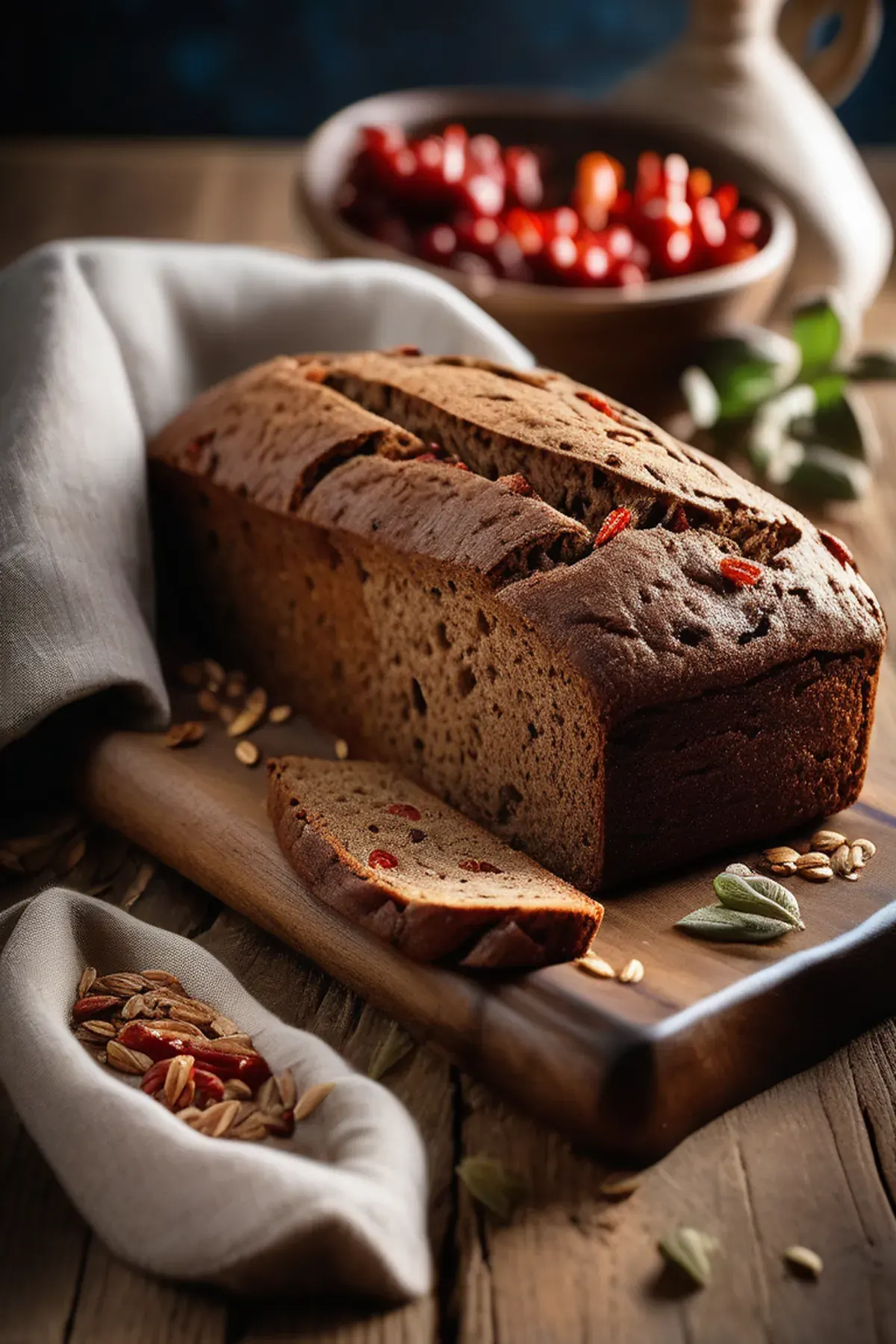 A rustic, nutty rye loaf studded with tangy sun-dried tomatoes and aromatic herbs, perfect for sandwiches or serving alongside soups and stews.