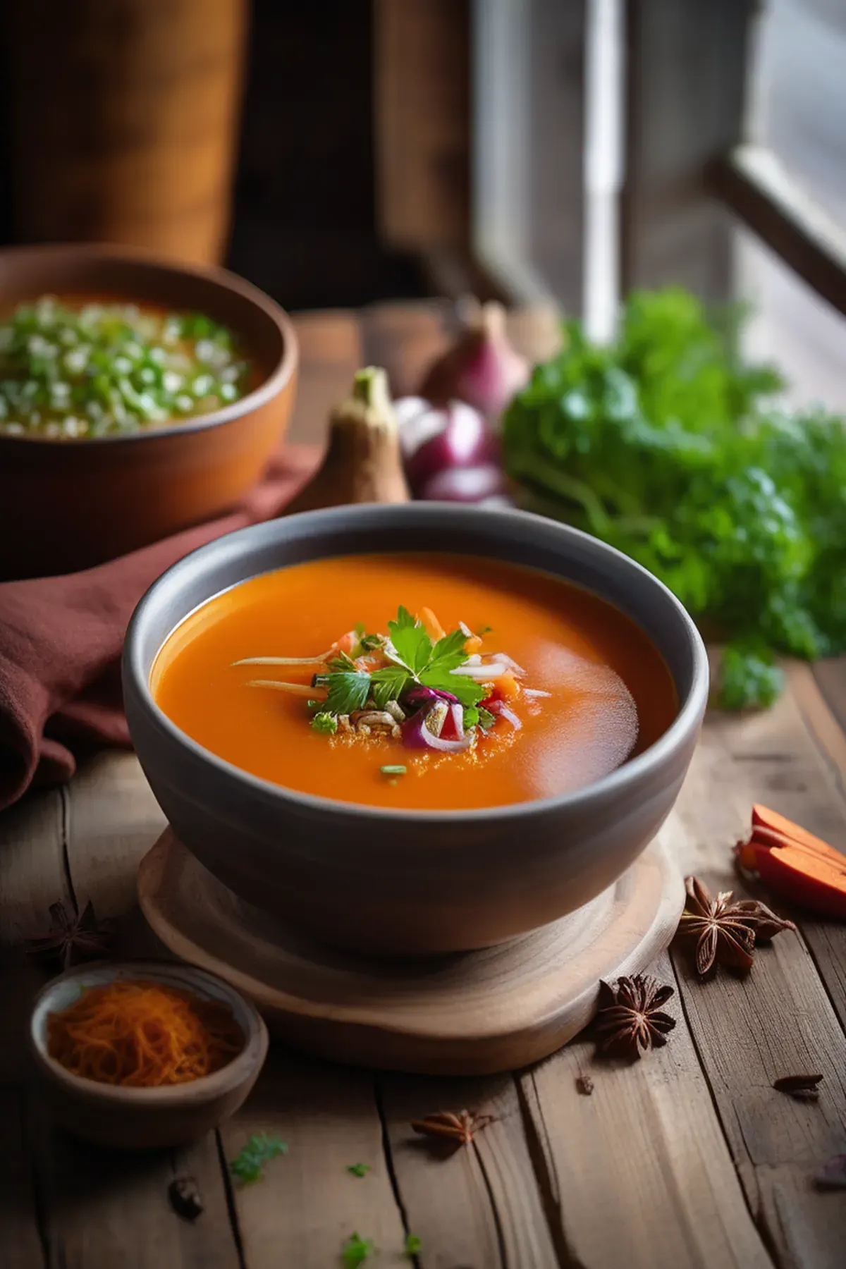 Serve the Sweet Potato Broth hot, garnished with fresh herbs if desired.
