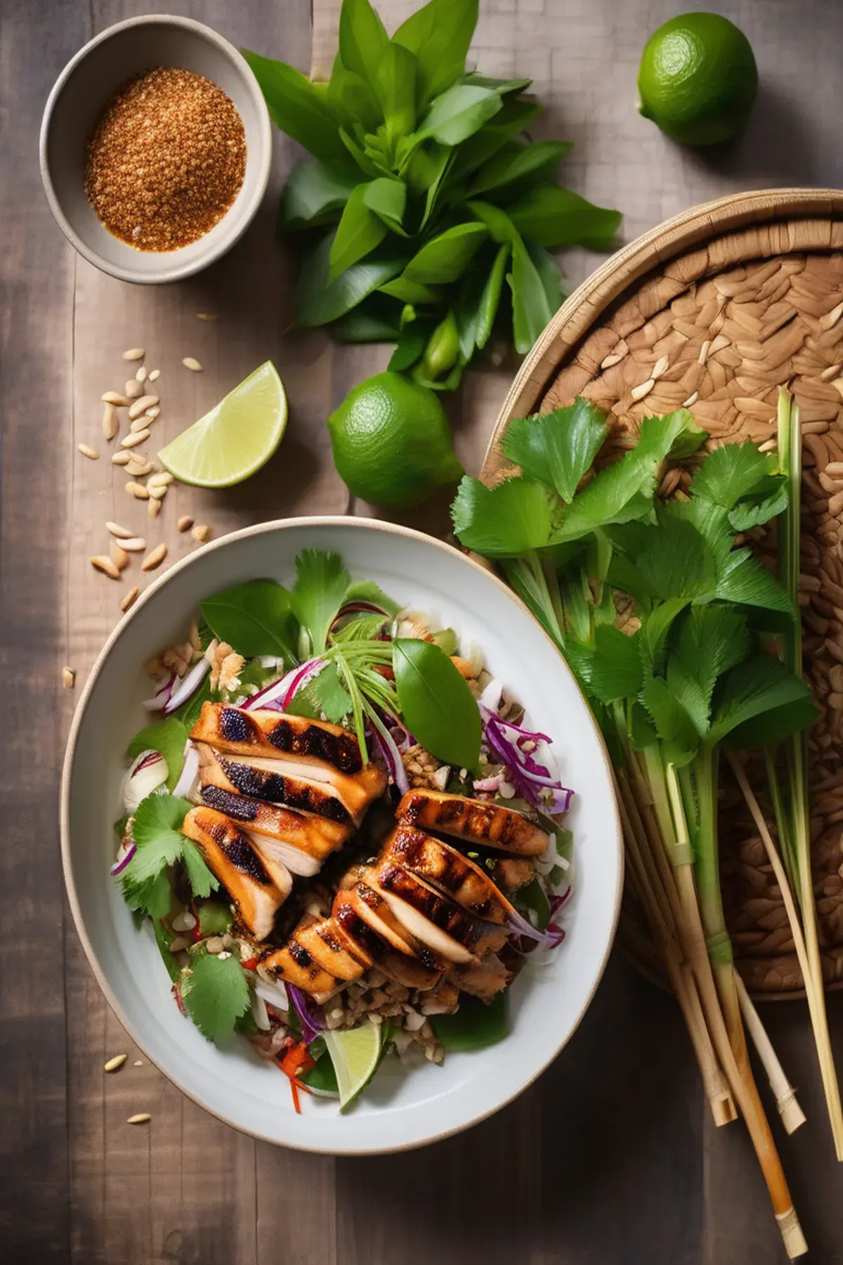 A fresh and spicy salad made with grilled chicken, crunchy vegetables, and a tangy dressing.