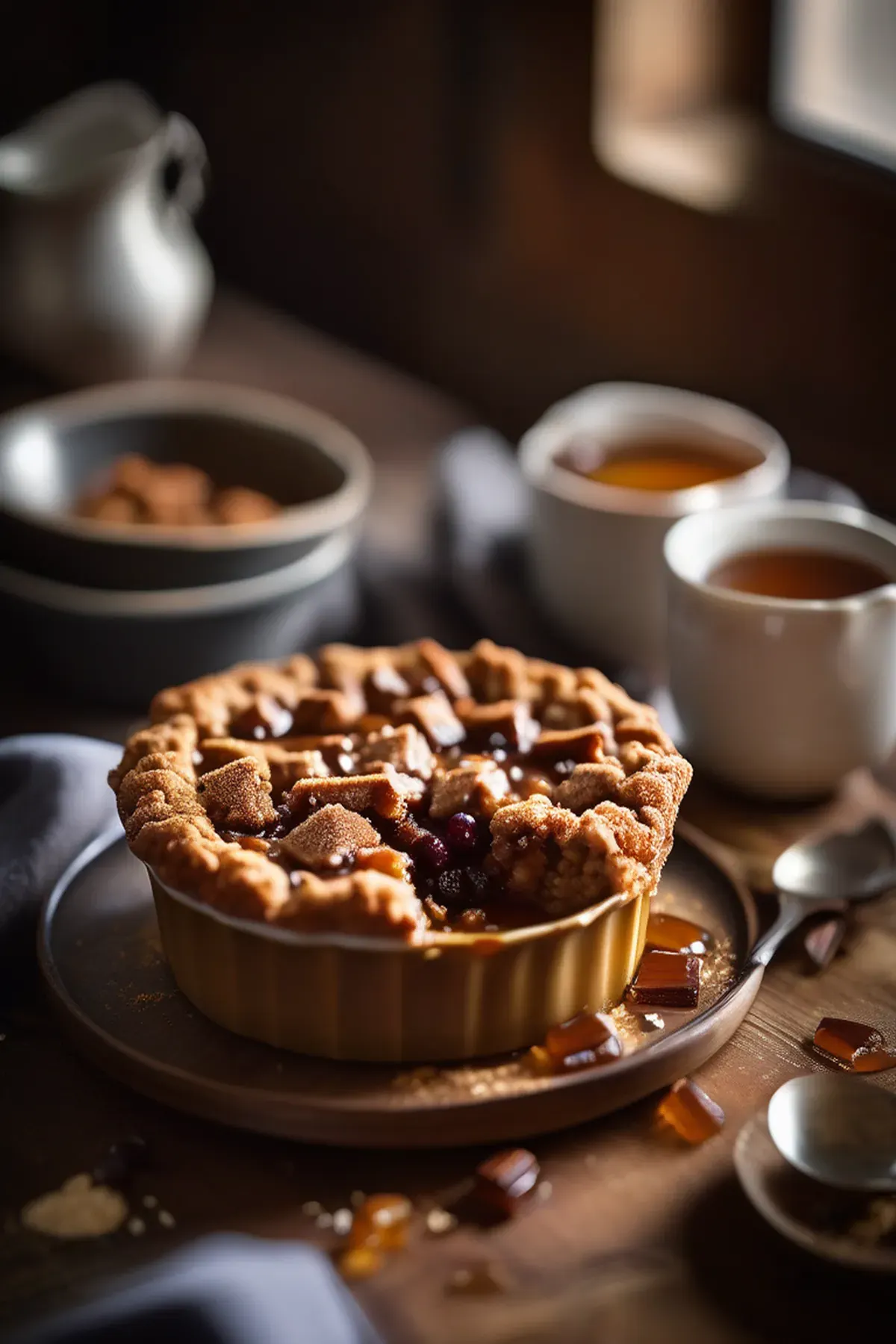 A rich and indulgent dessert featuring a layer of gooey toffee and crumbly biscuit topping.
