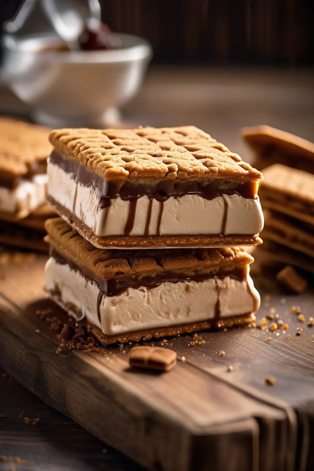 A classic ice cream sandwich with a twist, featuring crunchy toffee biscuits and creamy vanilla ice cream.