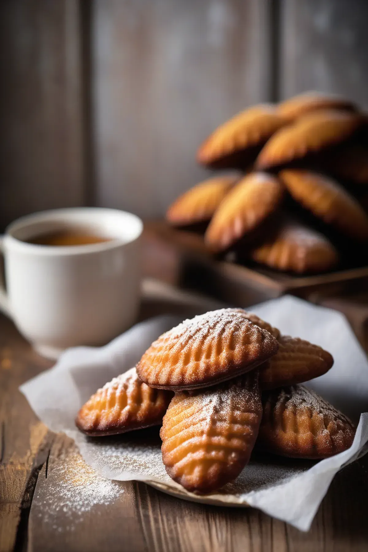 A delightful British dessert with a crispy exterior and a tender, toffee-filled center, made in the iconic madeleine mold.