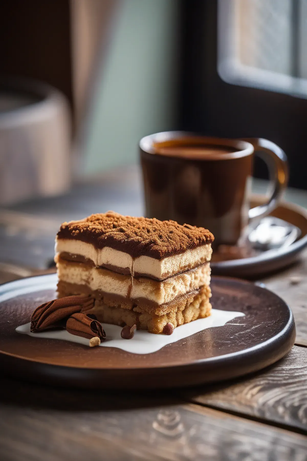 Top the tiramisu with the whipped cream and sprinkle with a pinch of espresso powder.