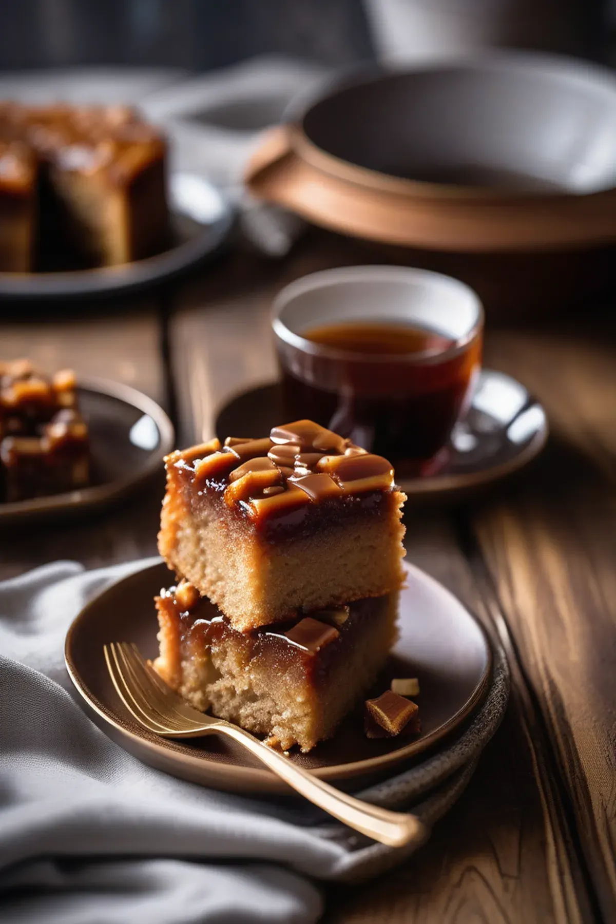 Rich and buttery cake with a layer of sticky toffee and crunchy nuts.