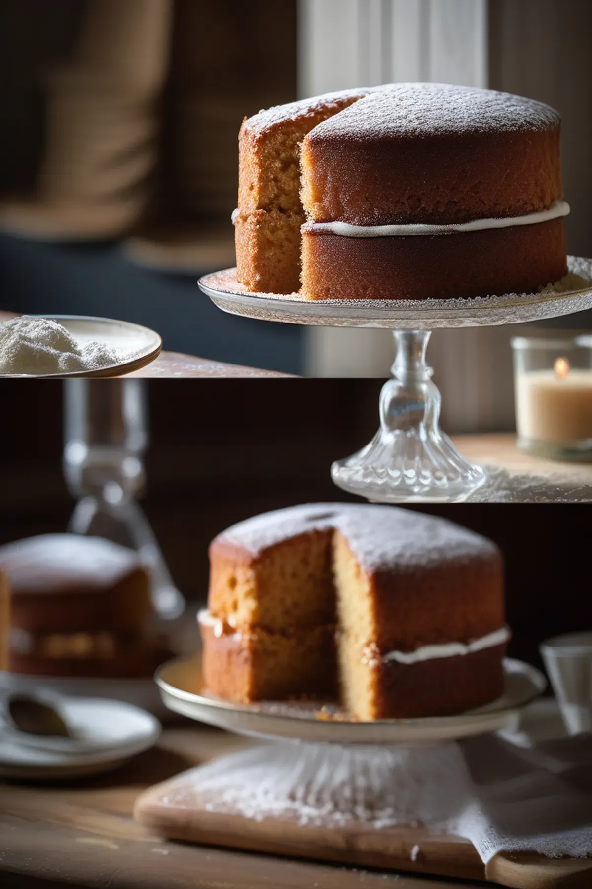 Dust the top of the sponge with plain flour before serving.