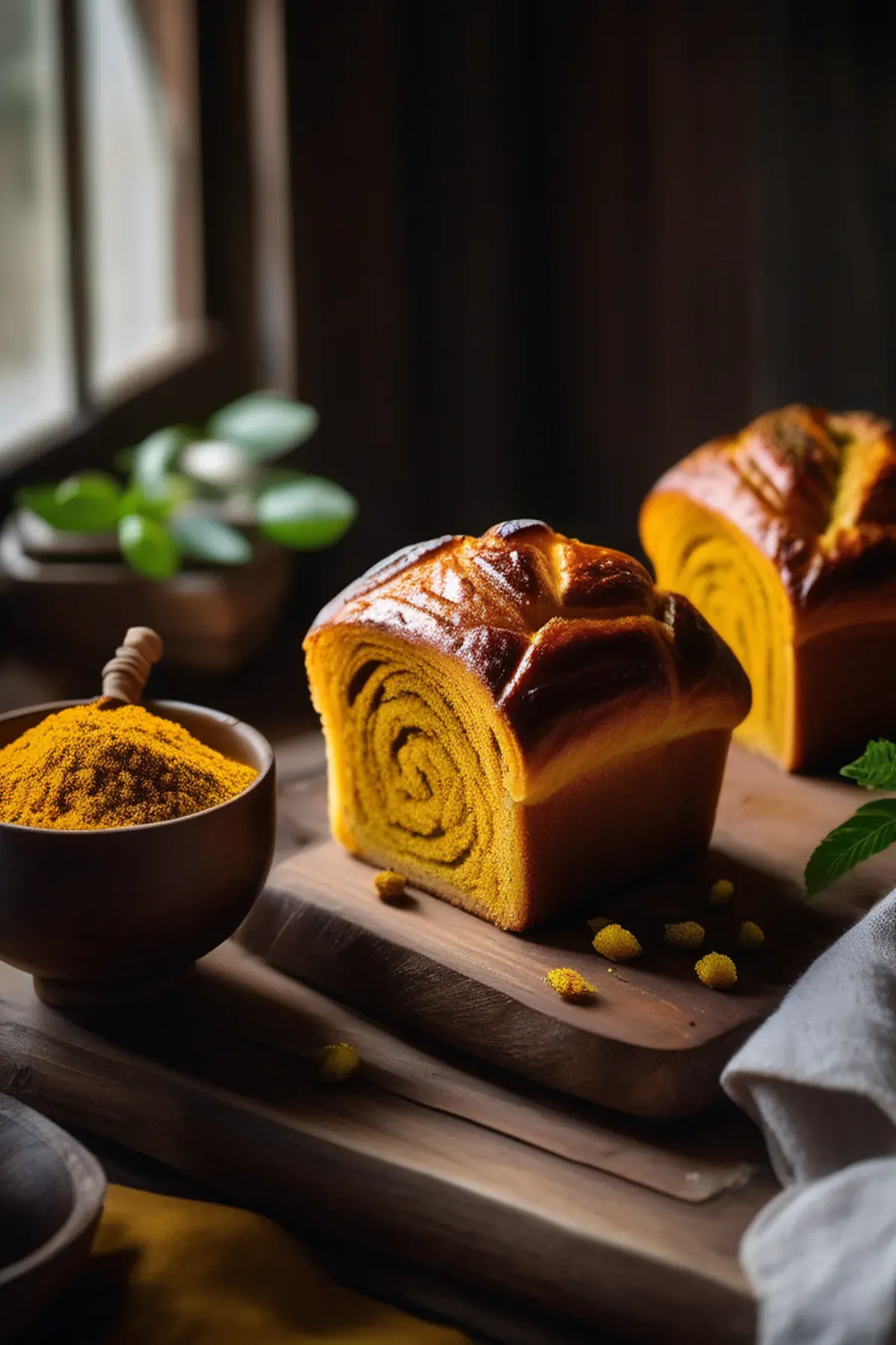 A luxurious golden brioche enriched with warm turmeric and a hint of cardamom, creating a subtly spiced, tender bread with a beautiful sunrise hue perfect for breakfast or afternoon tea.