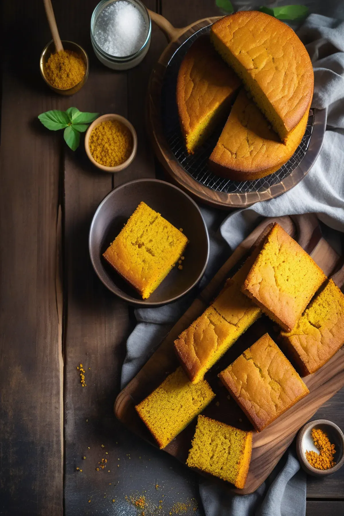 A vibrant golden cornbread infused with warm turmeric and a hint of honey, delivering a moist crumb with subtle earthy spice and natural sweetness.
