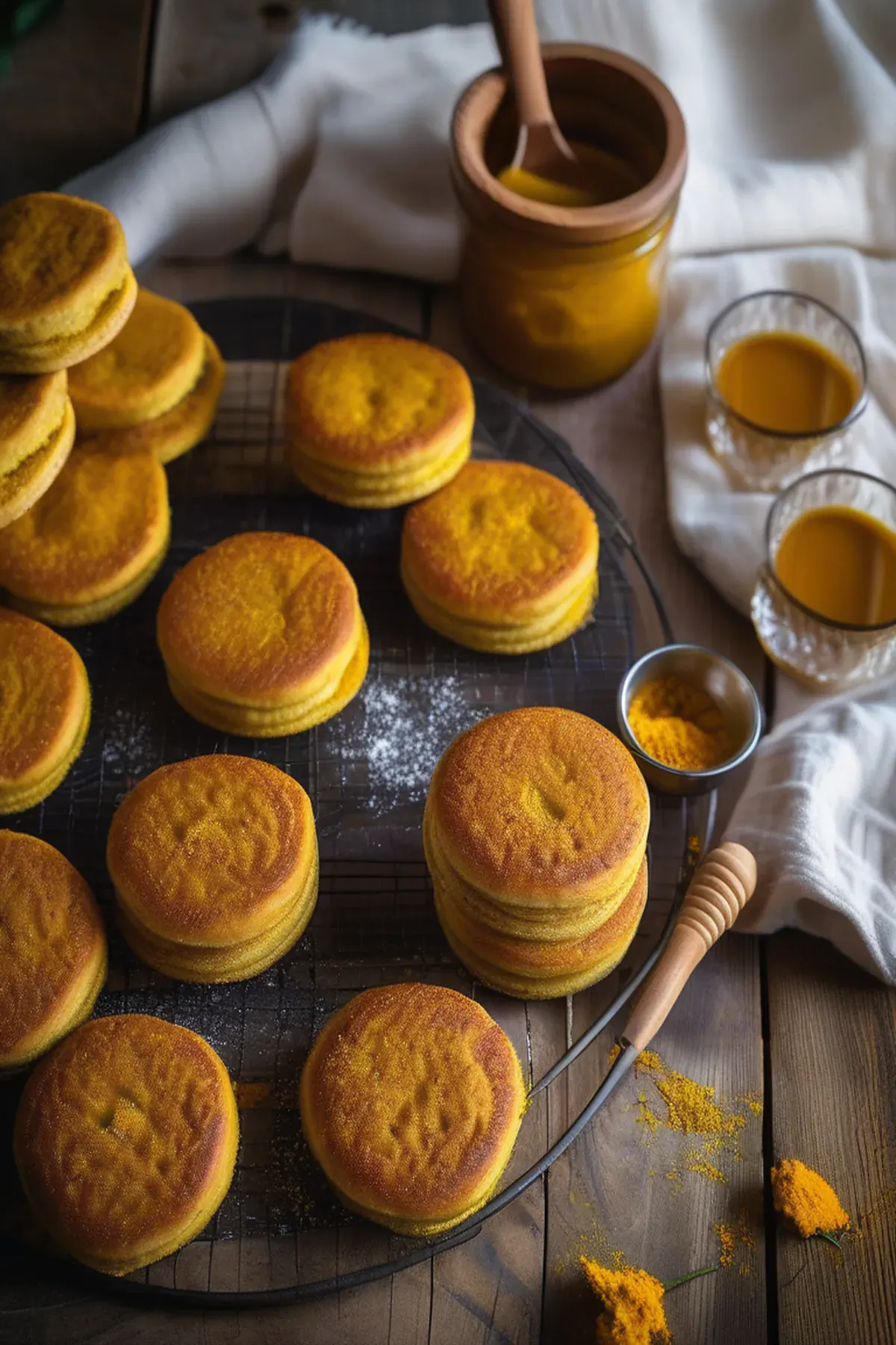 Golden, aromatic English muffins infused with warm turmeric and subtle spices, perfect for breakfast or a wholesome snack with a hint of earthy sophistication.