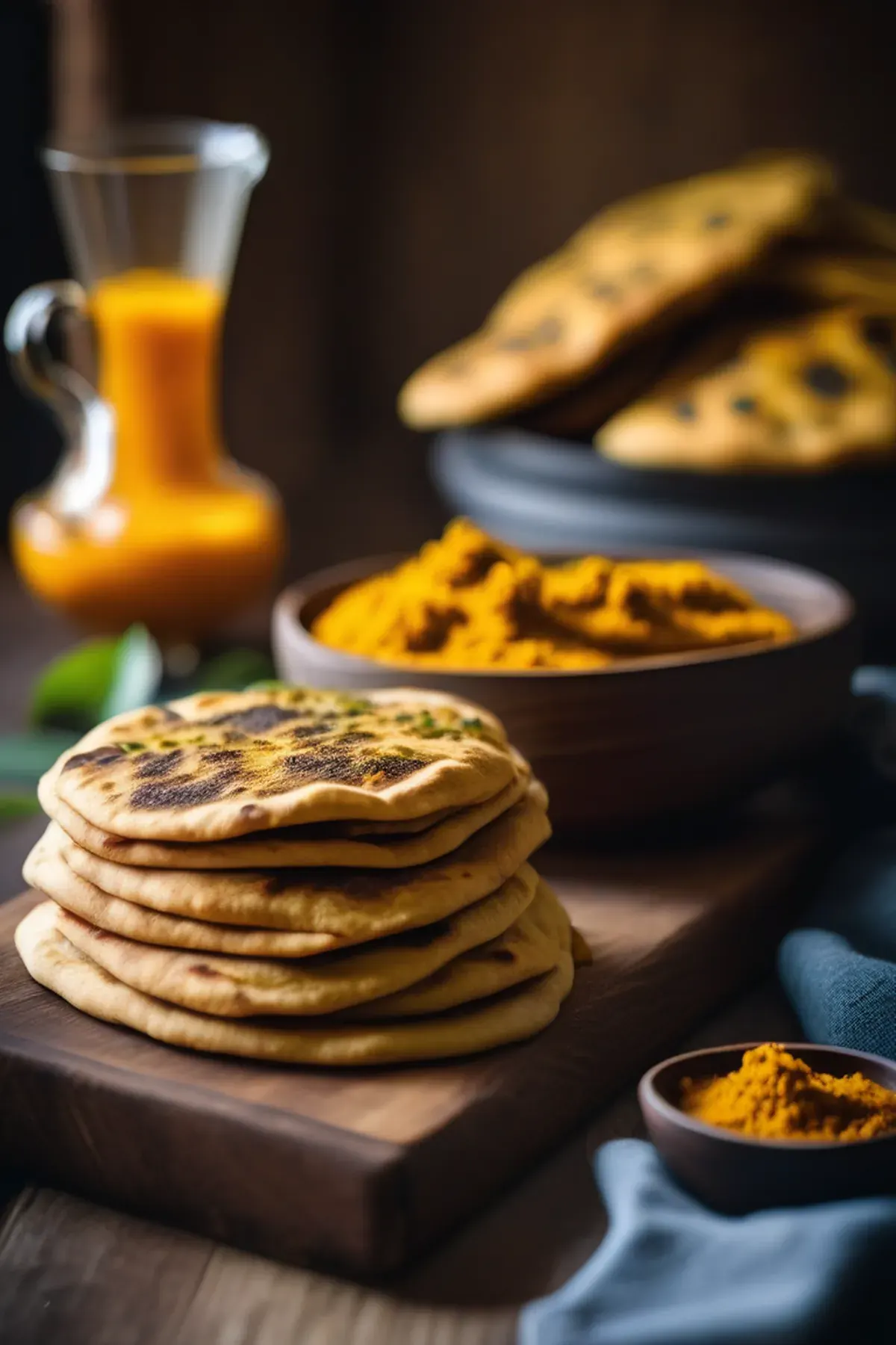 Golden, aromatic flatbread infused with warm turmeric and topped with nigella seeds. This vibrant naan is perfect for scooping curries or enjoying on its own.