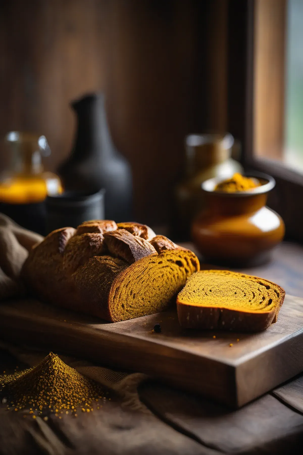 A vibrant golden sourdough bread infused with warm turmeric and black pepper, delivering subtle earthy flavors and beautiful color. Perfect for sandwiches or serving alongside soup.