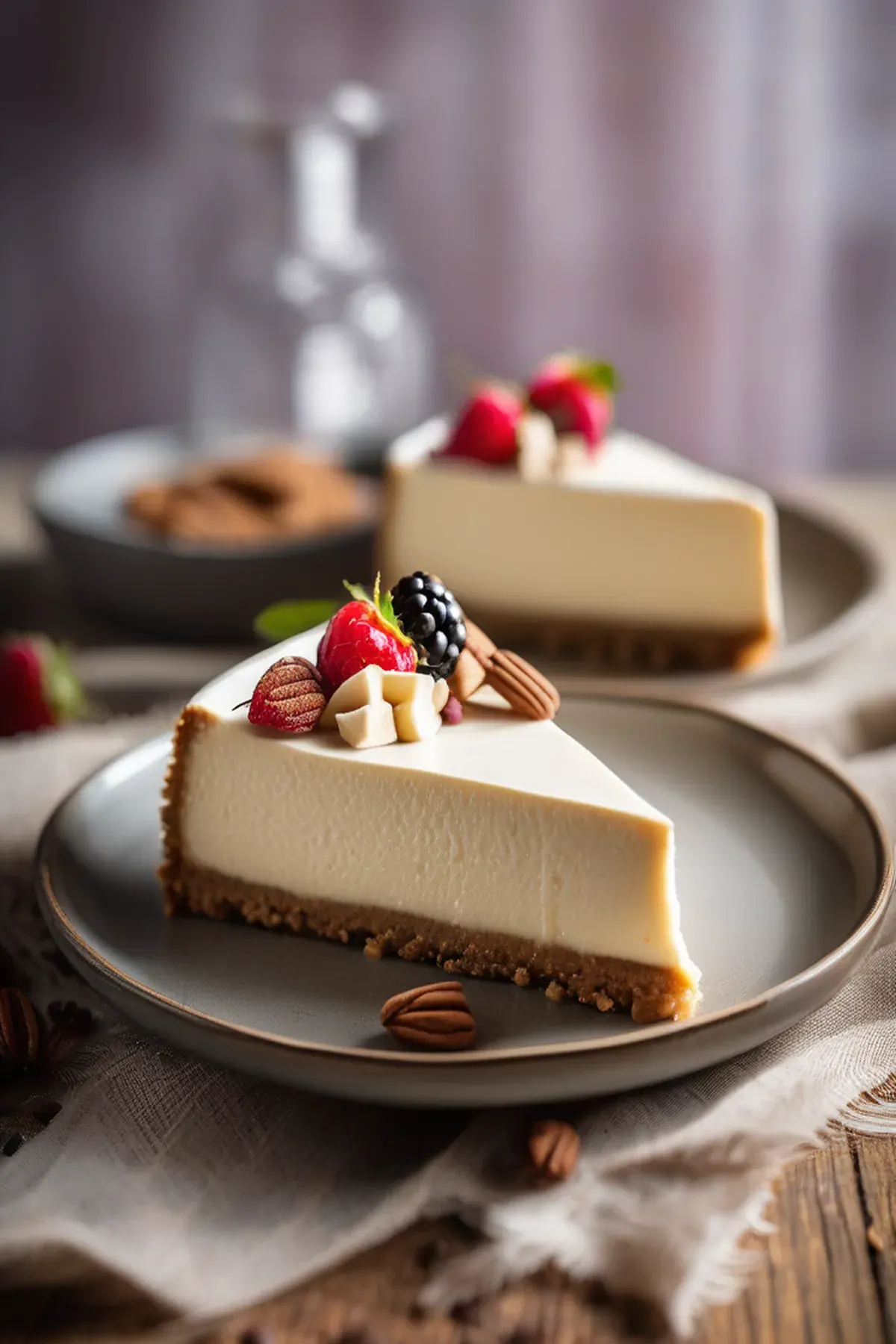 To serve, slice the cheesecake and dust with powdered sugar if desired.