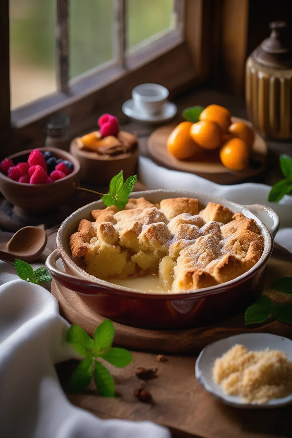A warm, comforting dessert filled with sweet vanilla and topped with a crumbly crust.