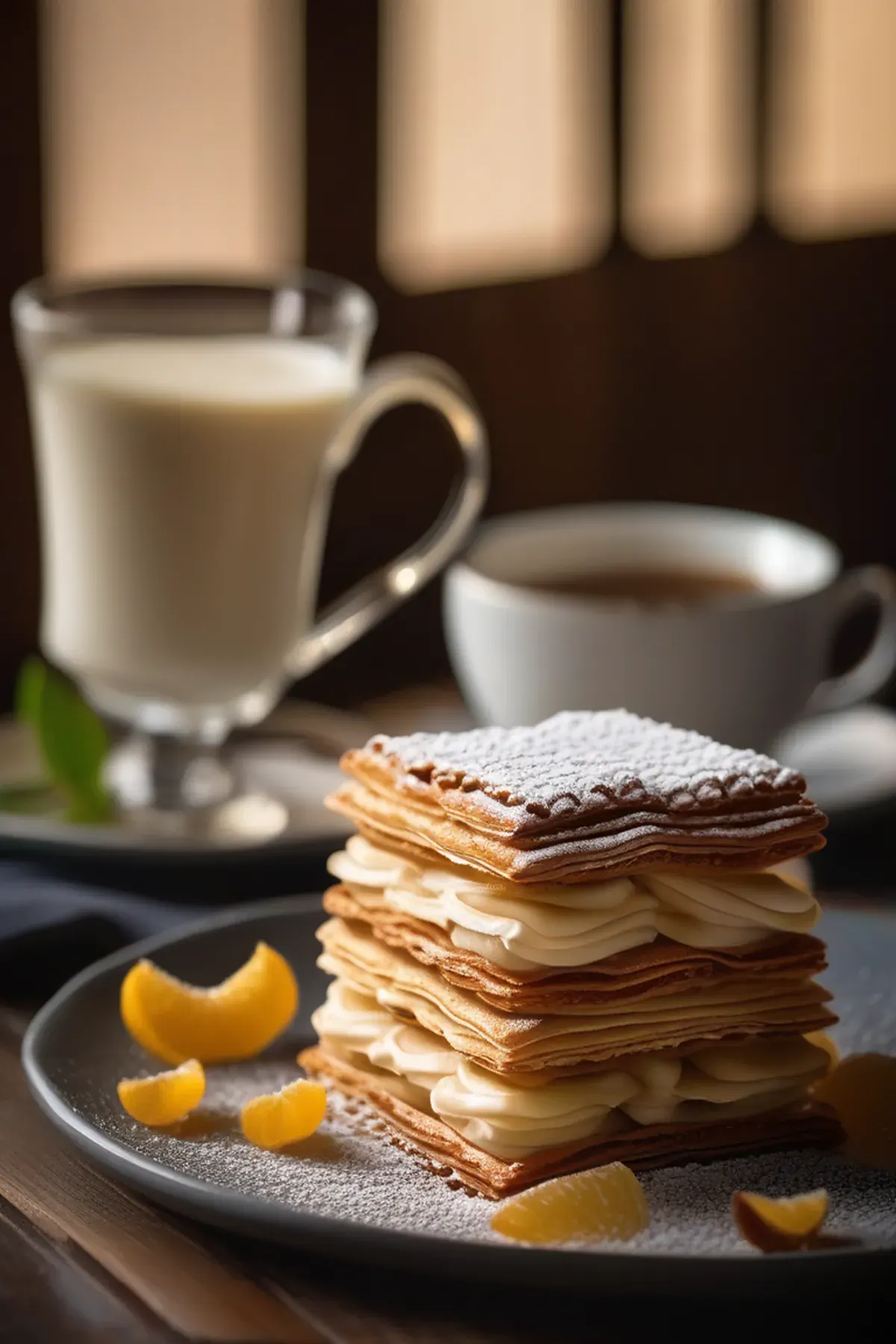 A layered French pastry with a delicate balance of flaky pastry, creamy vanilla filling, and caramelized sugar.
