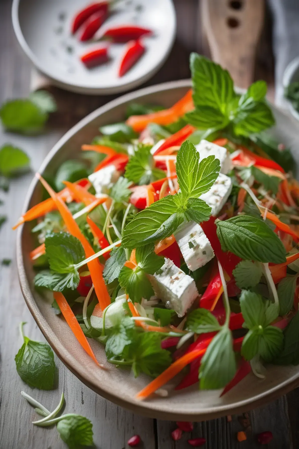 A refreshing salad featuring creamy goat cheese, crunchy vegetables, and tangy dressing.