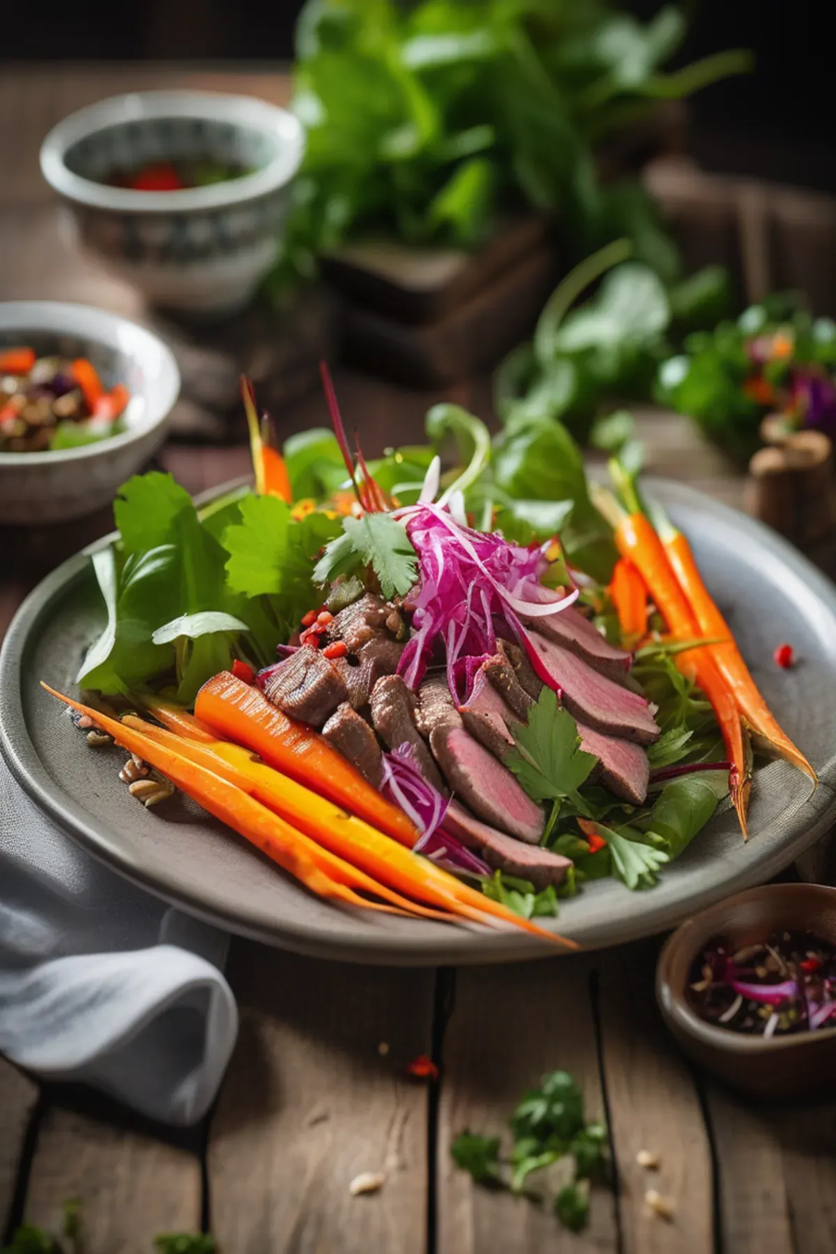 A refreshing salad from Vietnam made with lamb, mixed greens, and a tangy dressing.