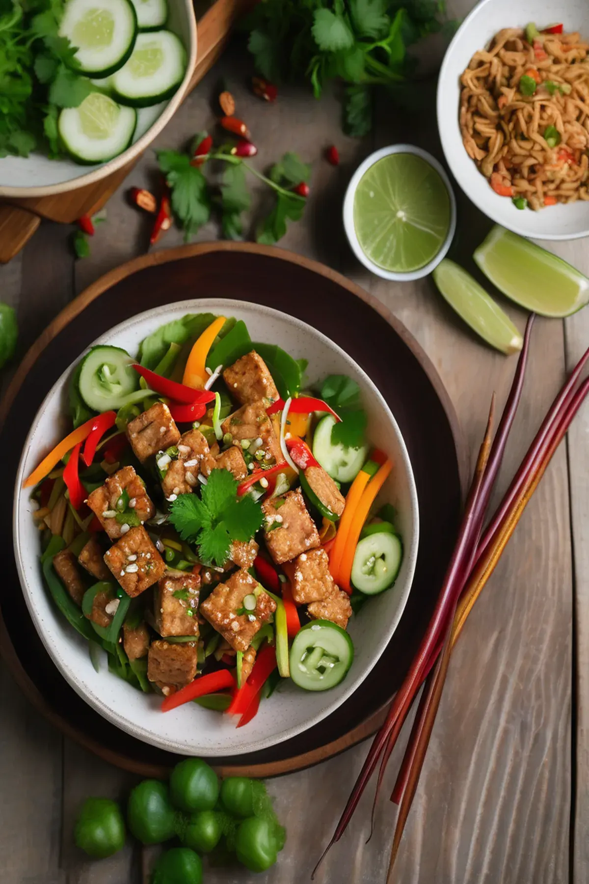 A fresh and flavorful salad featuring crispy tempeh, crunchy vegetables, and a zesty dressing.