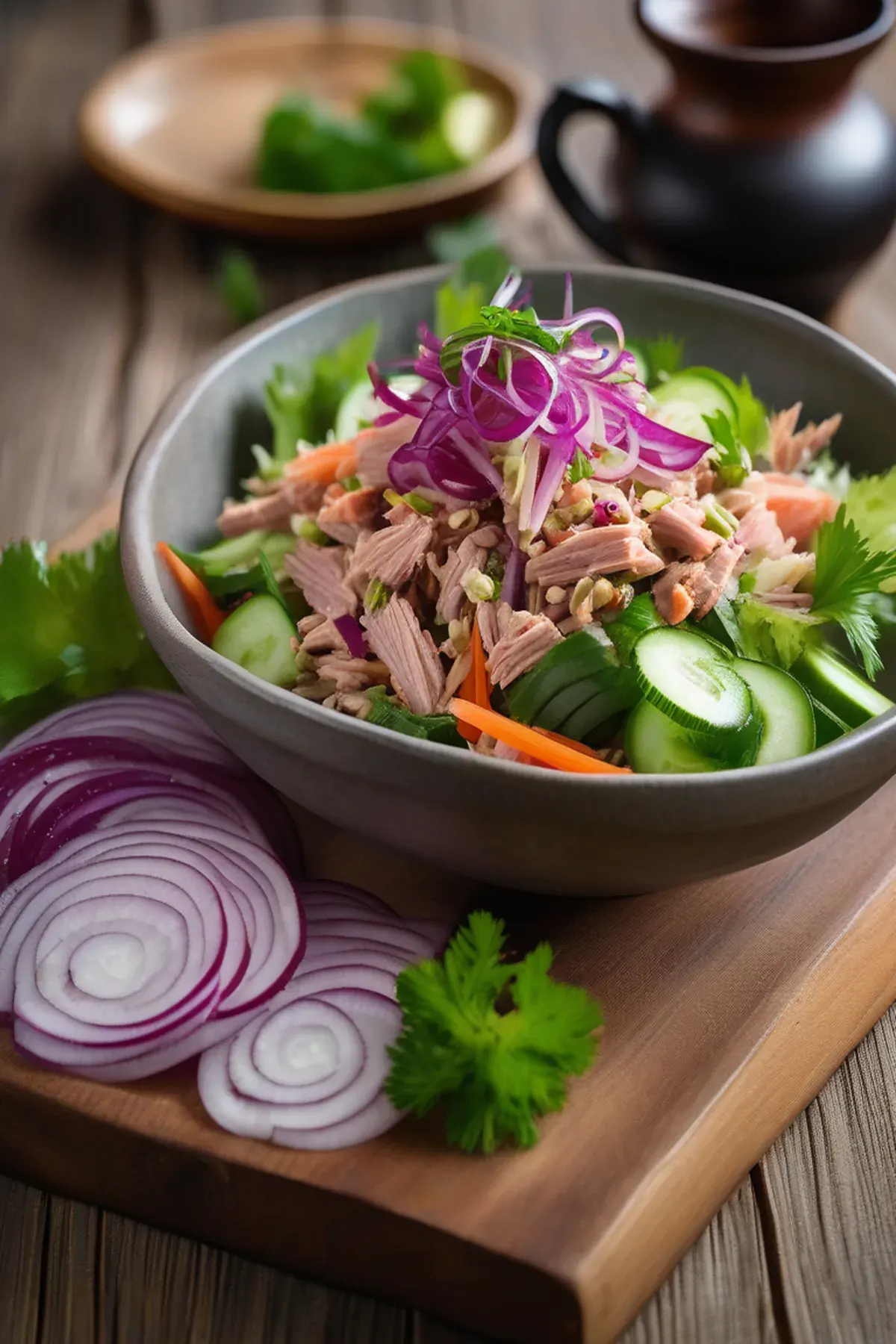 A fresh and zesty salad made with sashimi-grade tuna, crunchy veggies, and a tangy dressing.