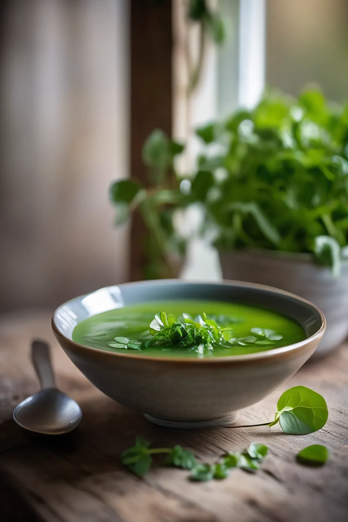 A refreshing and light soup made with the peppery taste of watercress, onions, and garlic.