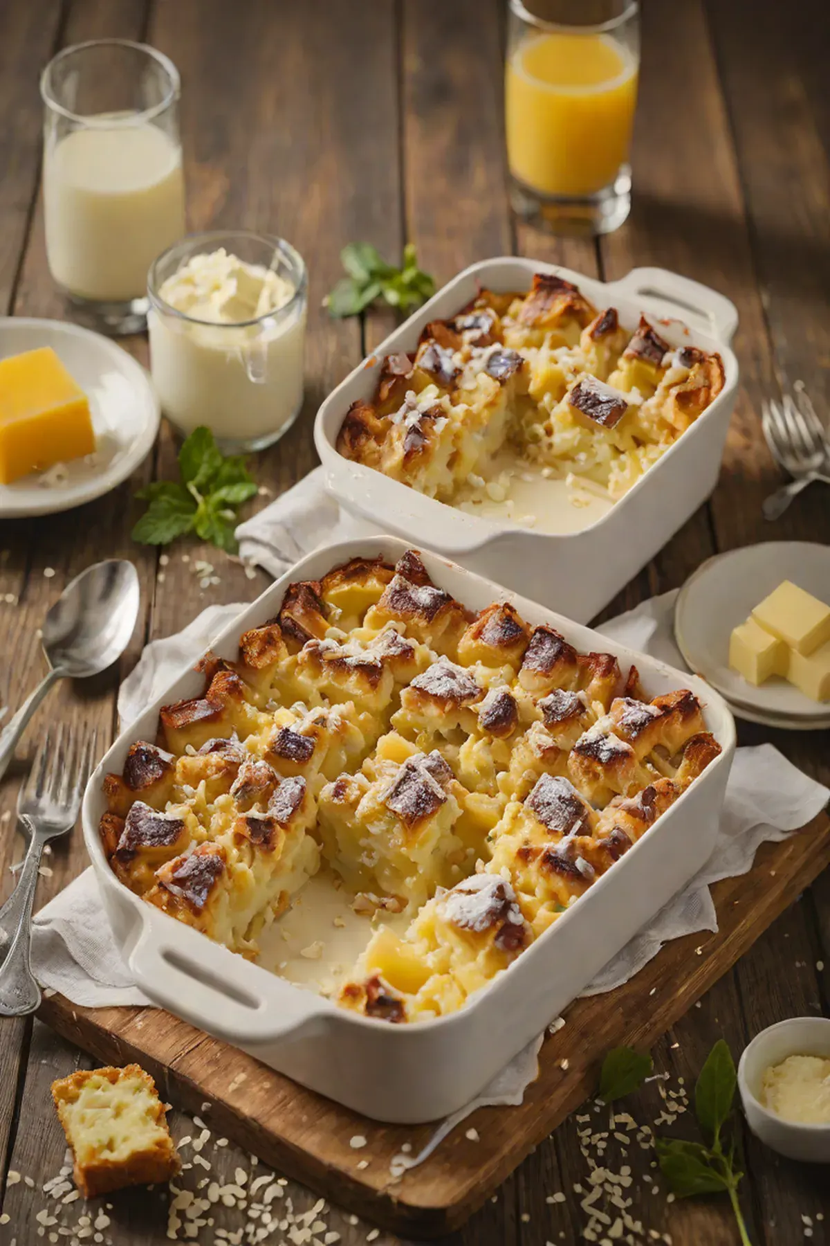 Pour the milk mixture over the bread, then sprinkle with the remaining bread cubes.