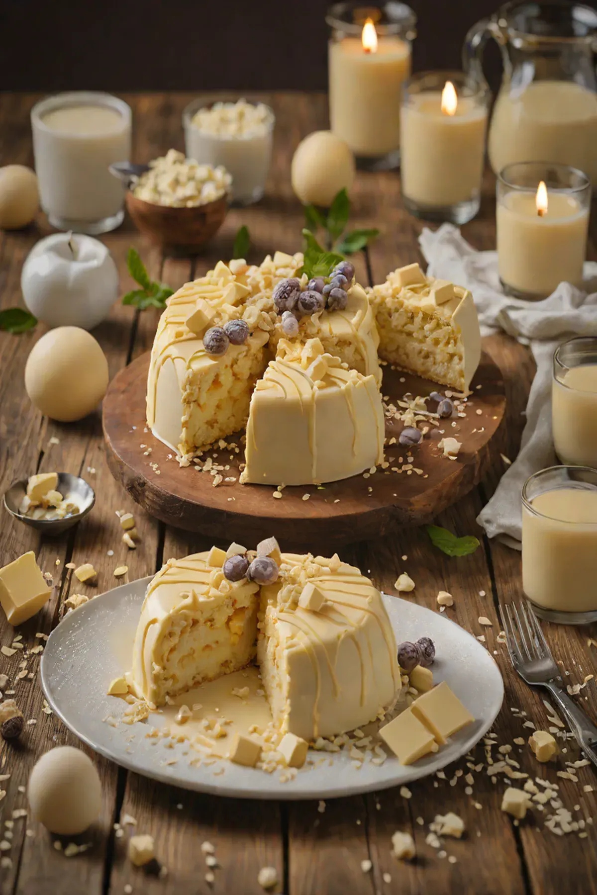 To make the mousse, whip the white chocolate and heavy cream in a large bowl until stiff peaks form. Fold the mousse over the top of the cake to create a layered effect.